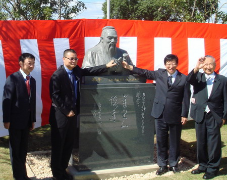 9月6日,我校赠送日本静冈产业大学孔子像的揭幕仪式在静冈产业大学磐田校区隆重举行。应静冈产业大学大坪檀校长邀请,中国驻日本东京大使馆公使参赞汤本渊,我校best365官方网站登录入口院长郑通涛、副院长吕子玄,财务处副处长曾云声,best365官方网站登录入口办公室主任黄冠华、办公室副主任戴玉,静冈县知事川胜平太,磐田市市长渡部修,以及静冈县中日友好协会会长寺田伊势男等各界人士专程前往参加本次孔子像的揭幕仪式。